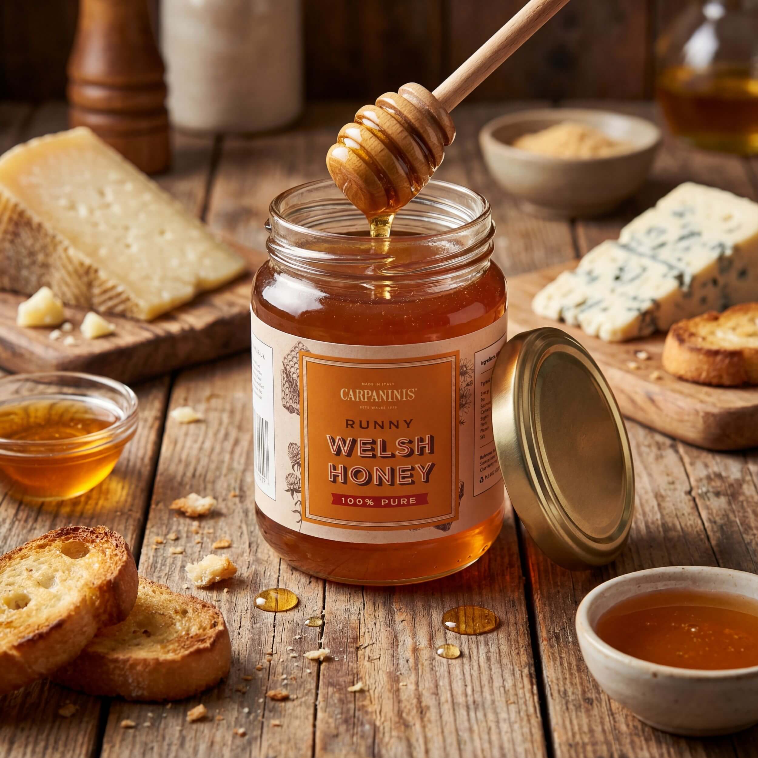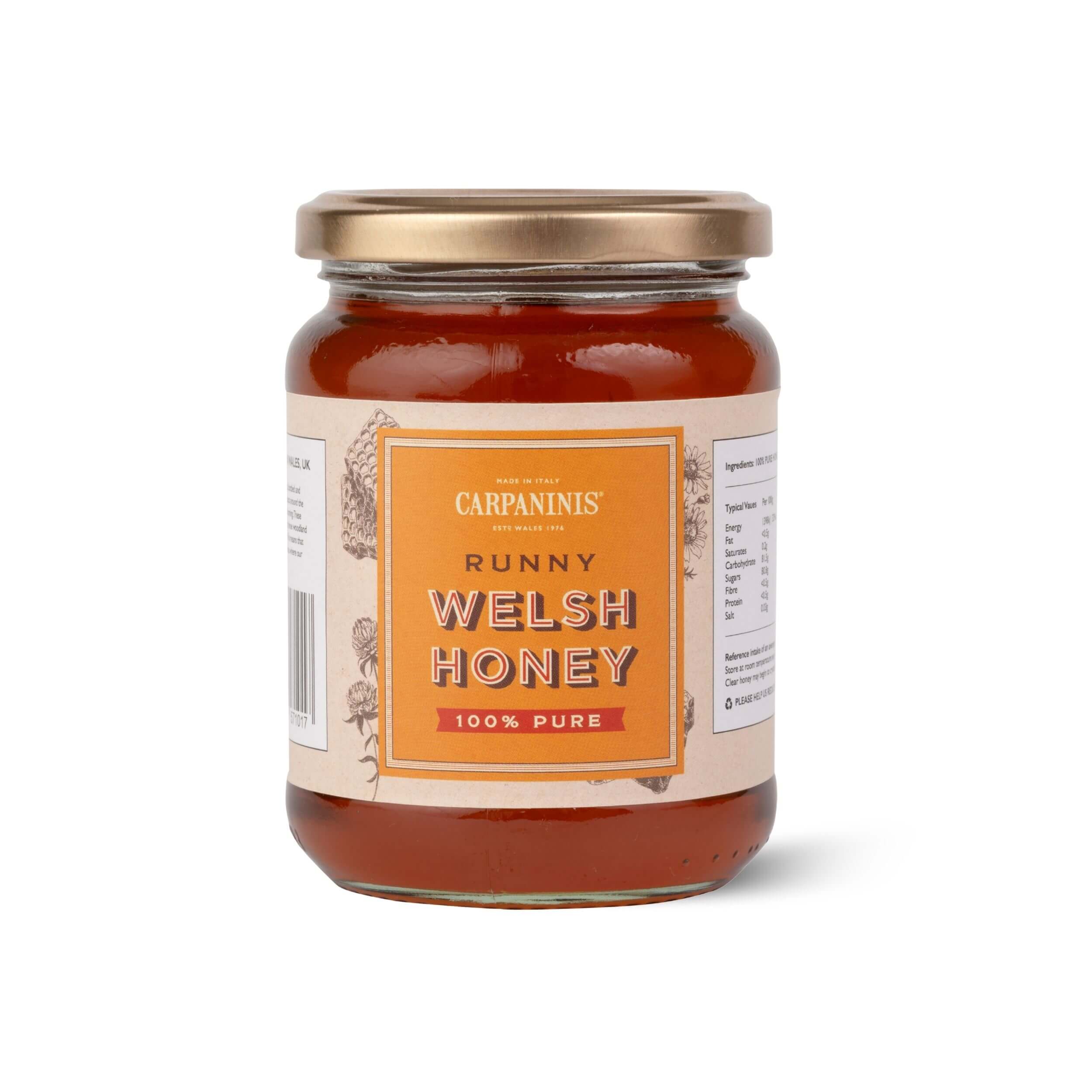 Light, golden, and beautifully pourable, Carpaninis Welsh Runny Honey captures the fresh floral character of the Welsh landscape. Naturally smooth with a clean, gentle sweetness, it’s an everyday essential — perfect for drizzling, stirring, and sweetening without overpowering.